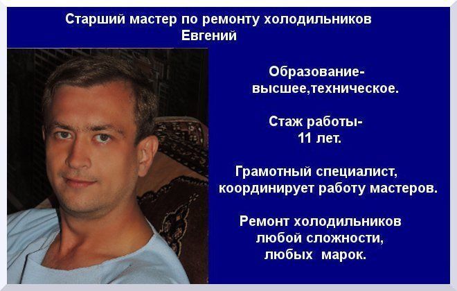 Все наши мастера-это профессионалы своего дела с огромным опытом работы! Они помогут в решении самого сложного ремонта холодильника. Не было моментов когда ремонт не удался по причине отсутствия запчастей или недостаточного опыта мастера.