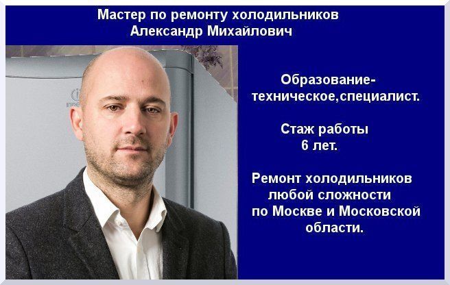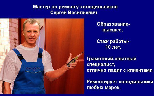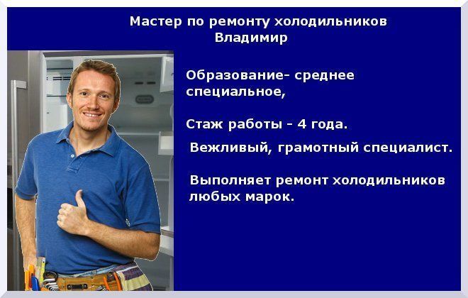 Все наши мастера-это профессионалы своего дела с огромным опытом работы! Они помогут в решении самого сложного ремонта холодильника. Не было моментов когда ремонт не удался по причине отсутствия запчастей или недостаточного опыта мастера.